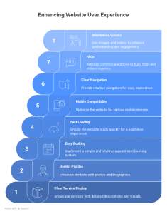 Your website should clearly show services, dentist profiles, and allow easy appointment booking. A website that loads quickly, works on mobile devices, and has clear navigation keeps visitors engaged and encourages bookings. Adding FAQs, service details, and informative visuals improves user experience and builds trust. Integrating