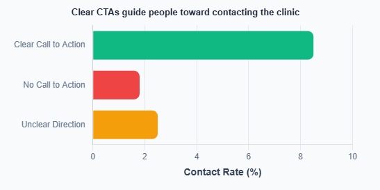 This graph shows how clear calls to action significantly improve contact rates for clinics. Campaigns with a clear CTA perform the best, as they guide users on exactly what to do next. When there is no call to action, very few people take the step to contact the clinic.