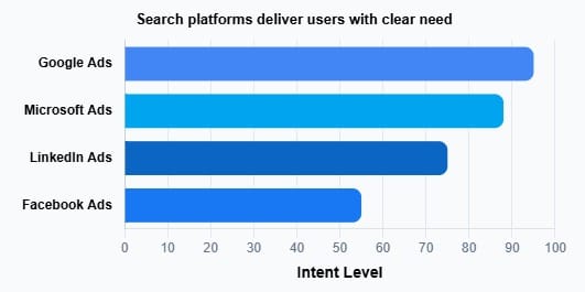 The graph compares intent levels across different advertising platforms. Google Ads and Microsoft Ads show the highest user intent because people actively search for products or services there. LinkedIn and Facebook Ads have lower intent since users are mainly browsing, making them better for awareness rather than direct conversions.